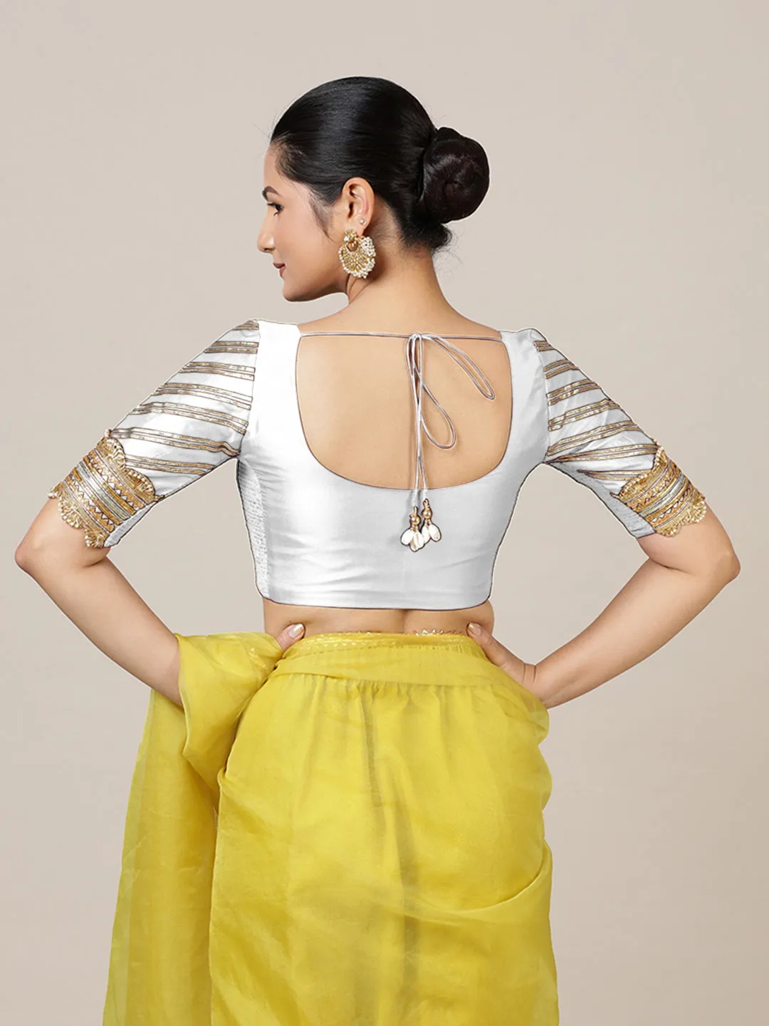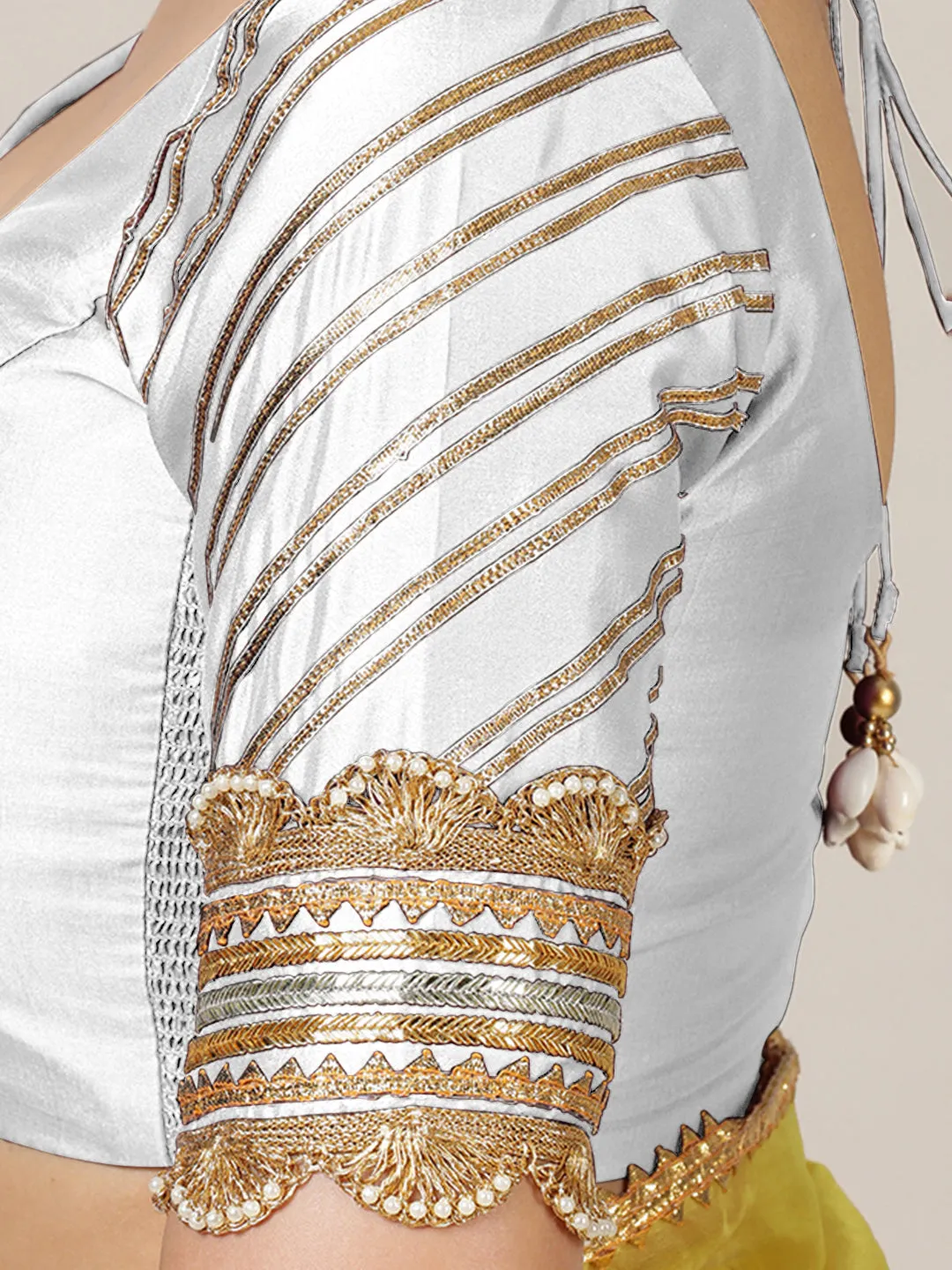 Discover the elegance of tradition with the "Anisha x Tyohaar | Elbow Sleeves Saree Blouse in Pearl White", a masterpiece designed to make your festivities and parties unforgettable.